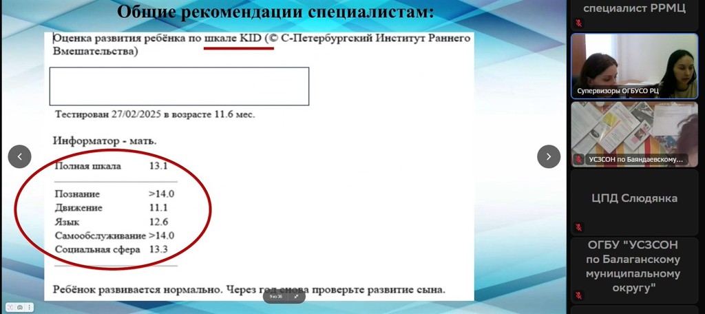 Во время онлайн-встречи эксперты отметили сильные стороны специалистов, а также предоставили общие рекомендации по совершенствованию технологии проведения первичного приема и консультаций для родителей, других членов семьи. Кроме того, участники получили рекомендации по использованию различных методических материалов.