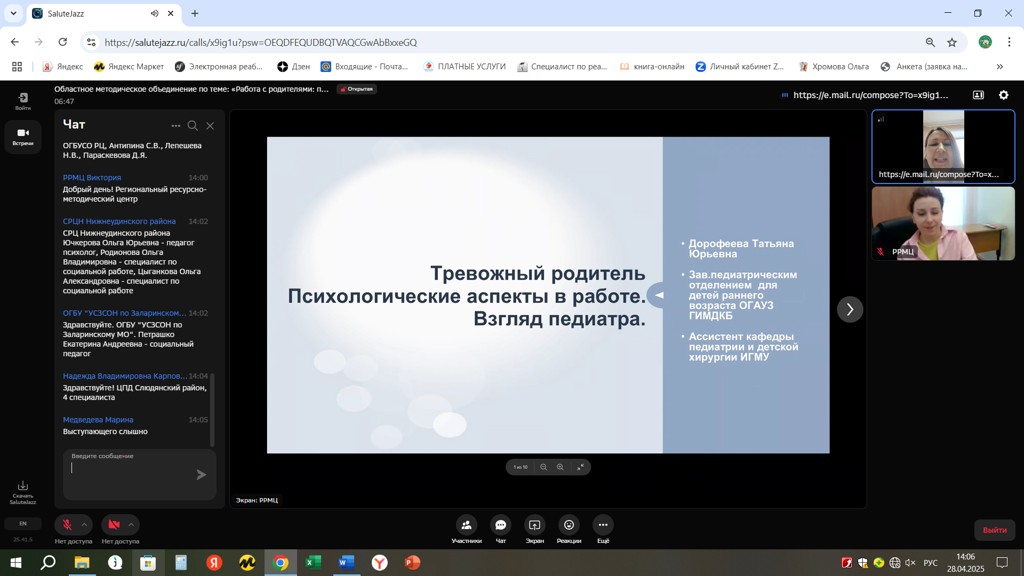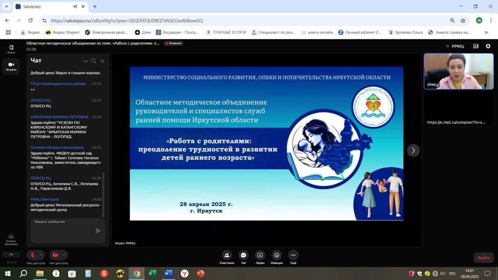 28 апреля 2025 года состоялось заседание областного методического объединения, собравшее более 70 руководителей и специалистов, оказывающих услуги ранней помощи детям и их семьям в Иркутской области. В формате онлайн-встречи участники обсудили тему: «Работа с родителями: преодоление трудностей в развитии детей раннего возраста», которая является одной из наиболее актуальных в сфере ранней помощи на сегодняшний день.