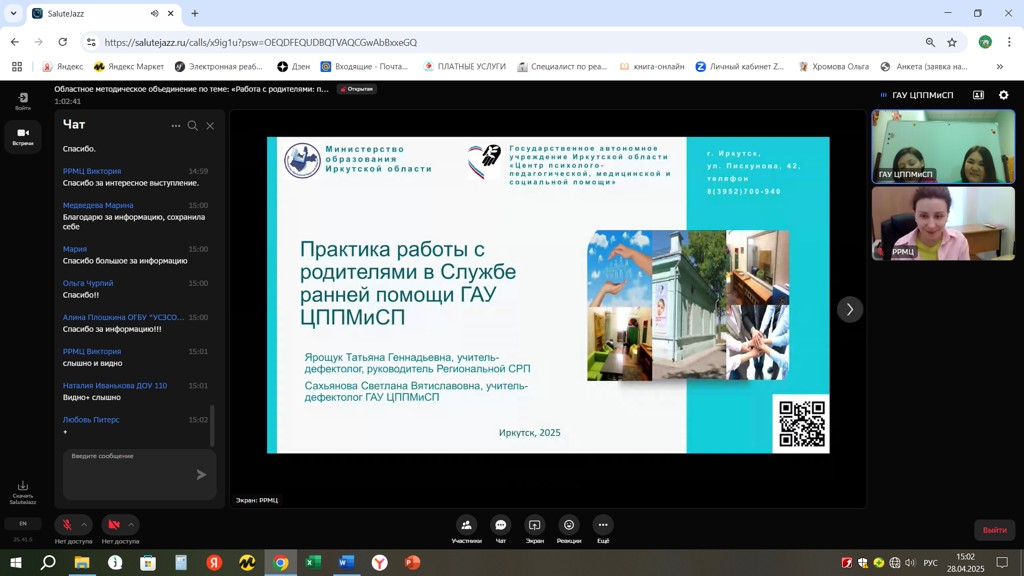 • Татьяна Геннадьевна Ярощук, учитель-дефектолог, руководитель Ресурсно-методического центра по ранней помощи в системе образования Иркутской области, и Светлана Вятиславовна Сахьянова, учитель-дефектолог ГАУИО «Центр психолого-педагогической, медицинской и социальной помощи», осветили проблемы практики работы с родителями в Службе ранней помощи ГАУ ЦППМиСП, обозначив ключевые направления и эффективные стратегии.