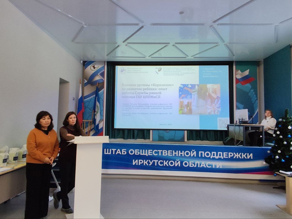В рамках площадки был представлен опыт работы специалистов ГАУ «Центр психолого-педагогической, медицинской и социальной помощи» с детьми с нарушениями пищевого поведения. Ярощук Татьяна Геннадьевна, учитель-дефектолог, руководитель ресурсно-методического центра ранней помощи в системе образования Иркутской области и Хангалова Нина Михайловна, учитель-дефектолог выступили с докладом «Влияние рутины «Кормление» на развитие ребенка».