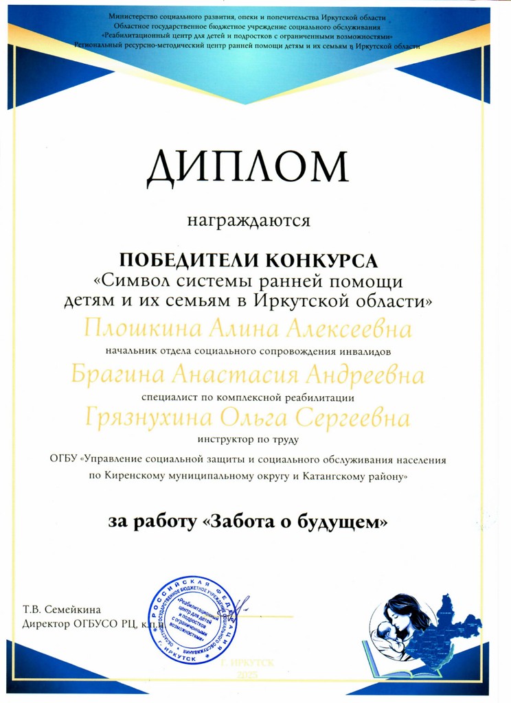 Мы поздравляем победителей - специалистов ОГБУ «Управление социальной защиты по Киренскому муниципальному округу и Катангскому району», авторов конкурсной работы «Забота о будущем», набравшей наибольшее количество голосов.